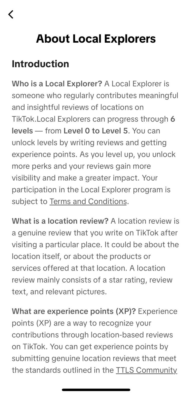 It works very similarly to becoming a Local Guide for Google. Creators in the program can tag and review local businesses. These reviews appear directly in TikTok’s search results and discovery feeds, and creators have the opportunity to earn XP for each review. The more XP, the higher level you are, and the more perks you have access to.